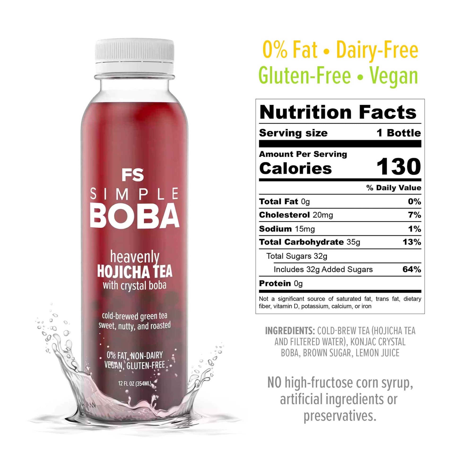 Roasted Green Tea (Naturally Caffeinated): Cold-Brew Tea (Hojicha Tea and Filtered Water), Konjac Crystal Boba, Brown Sugar, Lemon Juice.